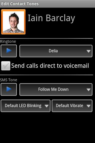 Ringo Pro will really shine as you start to apply its custom settings to caller groups and to individuals in your contact list. Each person can be assigned a unique ring tone, unique SMS tone, their own color of blinking LED (on phoens that support it), and a unique level of vibrate intensity. You will know instantly whether a call is from your brother, boss, or broker. One user sets a discrete ring tone and SMS tone as a default, then gives each important caller his or her unique tones.